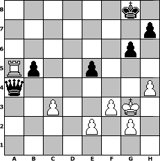 Partie-Notation im PGN-Format [Event "Mannschaftsturnier der letzen Mohikan3er"] [Site "www.mySchach.de"] [Date "2018.06.01"] [Round "1"] [White "Andylein1989"] [Black "miu"] [ECO "C62"] [WhitemyELO "1709"] [BlackmyELO "1553"] [Result "0-1"] [TimeControl "10/2592000"] [WhiteDays "113"] [BlackDays "120"] [MySchachNr "112311"] 1. e4 e5 2. Nf3 Nc6 3. Bb5 d6 4. c3 a6 5. Ba4 b5 6. Bc2 g6 7. d3 Bg7 8. Nbd2 Nge7 9. Nf1 O-O 10. Ng3 f5 11. exf5 Nxf5 12. Bg5 Qe8 13. Qc1 Nce7 14. Nxf5 Nxf5 15. h4 Bb7 16. Qd1 Bxf3 17. Qxf3 Nd4 18. Qd1 Nxc2+ 19. Qxc2 Qf7 20. f3 c5 21. Qd2 Qf5 22. Be7 Rf7 23. Bxd6 Rd8 24. Bxc5 Rxd3 25. Qf2 Bh6 26. O-O Rd2 27. Qg3 Rxb2 28. a4 Rc2 29. Bd6 Bf4 30. Qe1 Rd7 31. Bc5 Rdd2 32. Rf2 Bg3 33. axb5 Bxf2+ 34. Bxf2 Rxf2 35. Qxf2 Rxf2 36. Kxf2 Qc2+ 37. Kg3 axb5 38. Ra5 Qa4 0-1 Stellungs-Notation im FEN-Format 6k1/7p/6p1/Rp2p3/q6P/2P2PK1/4P1P1/8 - - - 2 39 Geschlagene Figuren Weiss: Geschlagene Figuren Schwarz: Klicken Sie auf eine geschlagene Figur um den gewünschten Zug darzustellen!