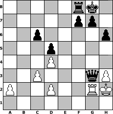 Partie-Notation im PGN-Format [Event "Einladungsturnier der Aljechins Enkel (AE)"] [Site "www.mySchach.de"] [Date "2007.10.19"] [Round "1"] [Board "6"] [White "Master1"] [Black "Knight"] [ECO "E00"] [WhitemyELO "1314"] [BlackmyELO "1303"] [Result "1/2-1/2"] [TimeControl "10/1728000"] [WhiteDays "42"] [BlackDays "54"] [MySchachNr "39007"] 1. d4 Nf6 2. c4 e6 3. Bg5 Bb4+ 4. Nc3 d5 5. e3 Nc6 6. Bd3 Bxc3+ 7. bxc3 O-O 8. cxd5 exd5 9. Qf3 Bg4 10. Qf4 Bh5 11. Bxf6 Qxf6 12. Qxc7 Rab8 13. Be2 Bg6 14. Nf3 Rfe8 15. Bb5 h6 16. Bxc6 bxc6 17. Qxa7 Be4 18. O-O Bxf3 19. gxf3 Qg5+ 20. Kh1 Qh5 21. Kg2 Rbd8 22. h3 Re6 23. Qc7 Rg6+ 24. Kh2 Rf8 25. Rg1 Qxf3 26. Raf1 Rxg1 27. Rxg1 Qxf2+ 28. Rg2 Qxe3 29. Qg3 Qxg3+ 1/2-1/2 Stellungs-Notation im FEN-Format 5rk1/5pp1/2p4p/3p4/3P4/2P3qP/P2P2RK/8 - - - 0 30 Geschlagene Figuren Weiss: Geschlagene Figuren Schwarz: Klicken Sie auf eine geschlagene Figur um den gewünschten Zug darzustellen!