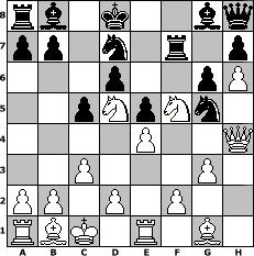 Partie-Notation im PGN-Format [Event "August16"] [Site "www.mySchach.de"] [Date "2016.08.16"] [Round "1"] [White "muetoe"] [Black "reisinger"] [Variant "Fischerrandom"] [SetUp "1"] [FEN "rbknrnbq/pppppppp/8/8/8/8/PPPPPPPP/RBKNRNBQ w KQkq - 0 1"] [WhitemyELO "1961"] [BlackmyELO "1475"] [Result "1-0"] [TimeControl "10/2592000"] [WhiteDays "60"] [BlackDays "60"] [MySchachNr "104528"] 1. f4 c5 2. g3 d6 3. e4 f6 4. c3 e5 5. fxe5 fxe5 6. Nfe3 Nde6 7. h4 Nd7 8. h5 Rf8 9. Nd5 Rf7 10. N1e3 Ng5 11. Nf5 Kd8 12. h6 g6 13. Qh4 1-0 Stellungs-Notation im FEN-Format rb1k2bq/pp1n1r1p/3p2pP/2pNpNn1/4P2Q/2P3P1/PP1P1P2/RBK1R1B1 - KQ - 1 13 Geschlagene Figuren Weiss: ![]() ![]() ![]() ![]() ![]() ![]() ![]() ![]() ![]() ![]() ![]() ![]() ![]() ![]() ![]() Geschlagene Figuren Schwarz: ![]() ![]() ![]() ![]() ![]() ![]() ![]() ![]() ![]() ![]() ![]() ![]() ![]() ![]() ![]() Klicken Sie auf eine geschlagene Figur um den gewünschten Zug darzustellen!