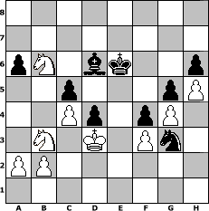 Partie-Notation im PGN-Format [Event "Es wird bald Sommer"] [Site "www.mySchach.de"] [Date "2015.05.12"] [Round "1"] [White "Schefsche"] [Black "reisinger"] [ECO "B20"] [WhitemyELO "1452"] [BlackmyELO "1534"] [Result "1/2-1/2"] [TimeControl "10/2592000"] [WhiteDays "30"] [BlackDays "30"] [MySchachNr "99213"] 1. e4 c5 2. Bc4 e6 3. d3 d5 4. exd5 exd5 5. Bb5+ Bd7 6. Qe2+ Be7 7. Bxd7+ Nxd7 8. Nf3 Ngf6 9. O-O O-O 10. Bg5 Re8 11. c4 d4 12. Bxf6 Nxf6 13. Nbd2 Bd6 14. Qd1 Qc7 15. g3 Re7 16. Qa4 Nh5 17. Rfe1 a6 18. Rxe7 Qxe7 19. Re1 Qc7 20. Re8+ Rxe8 21. Qxe8+ Bf8 22. Ne4 g6 23. Nfg5 Qe7 24. Qxe7 Bxe7 25. h4 b5 26. Kf1 bxc4 27. dxc4 h6 28. Nf3 f5 29. Ned2 Nf6 30. Ne5 Kg7 31. Nb3 Ne4 32. Ke2 Bd6 33. Nd7 g5 34. h5 f4 35. g4 Kf7 36. f3 Ke6 37. Nb6 Ng3+ 38. Kd3 1/2-1/2 Stellungs-Notation im FEN-Format 8/8/pN1bk2p/2p3pP/2Pp1pP1/1N1K1Pn1/PP6/8 - - - 4 38 Geschlagene Figuren Weiss: Geschlagene Figuren Schwarz: Klicken Sie auf eine geschlagene Figur um den gewünschten Zug darzustellen!