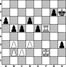 Partie-Notation im PGN-Format [Event "Husarenritt"] [Site "www.mySchach.de"] [Date "2005.11.23"] [Round "2"] [White "Joschi"] [Black "Vouivre"] [ECO "C57"] [WhitemyELO "1670"] [BlackmyELO "1462"] [Result "1-0"] [TimeControl "10/1728000"] [WhiteDays "72"] [BlackDays "80"] [MySchachNr "19979"] 1. e4 e5 2. Nf3 Nc6 3. Bc4 Nf6 4. Ng5 Bc5 5. O-O O-O 6. Nc3 d6 7. d3 a6 8. h3 b5 9. Bb3 Nd4 10. Nf3 Nxb3 11. axb3 Be6 12. Re1 h6 13. Be3 Bxe3 14. Rxe3 c5 15. Qd2 Qd7 16. Ree1 Bxh3 17. gxh3 Qxh3 18. Nh2 Nh5 19. Qe3 Qe6 20. Ne2 f5 21. exf5 Rxf5 22. Ng3 Nxg3 23. fxg3 Raf8 24. Rf1 R8f6 25. Rxf5 Rxf5 26. Rf1 Rg5 27. Kg2 Qg6 28. Qf3 h5 29. Qf8+ Kh7 30. Rf3 h4 31. g4 Rxg4+ 32. Nxg4 Qxg4+ 33. Kf2 h3 34. Qf5+ Qxf5 35. Rxf5 1-0 Stellungs-Notation im FEN-Format 8/6pk/p2p4/1pp1pR2/8/1P1P3p/1PP2K2/8 - - - 0 35 Geschlagene Figuren Weiss: Geschlagene Figuren Schwarz: Klicken Sie auf eine geschlagene Figur um den gewünschten Zug darzustellen!