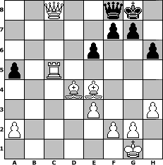 Partie-Notation im PGN-Format [Event "Neues Jahr 2010"] [Site "www.mySchach.de"] [Date "2010.01.01"] [Round "1"] [White "lasker"] [Black "Master1"] [ECO "D10"] [WhitemyELO "1347"] [BlackmyELO "1270"] [Result "1-0"] [TimeControl "10/3456000"] [WhiteDays "160"] [BlackDays "157"] [MySchachNr "61995"] 1. d4 d5 2. c4 c6 3. Nc3 Nf6 4. Nf3 Bf5 5. e3 e6 6. cxd5 Nxd5 7. Be2 Bb4 8. Bd2 Nxc3 9. bxc3 Bd6 10. O-O h6 11. c4 b6 12. h3 Be4 13. Bc3 a6 14. Nd2 Bg6 15. Bf3 O-O 16. Ne4 Be7 17. Re1 Bxe4 18. Bxe4 a5 19. Rb1 Ra7 20. Qa4 c5 21. Red1 Rd7 22. dxc5 Rxd1+ 23. Rxd1 Qc7 24. cxb6 Qxb6 25. Bd4 Qc7 26. c5 Bxc5 27. Rc1 Na6 28. Qc4 Rc8 29. Qxa6 Qe7 30. Qxc8+ Qf8 31. Rxc5 1-0 Stellungs-Notation im FEN-Format 2Q2qk1/5pp1/4p2p/p1R5/3BB3/4P2P/P4PP1/6K1 - - - 0 31 Geschlagene Figuren Weiss: Geschlagene Figuren Schwarz: Klicken Sie auf eine geschlagene Figur um den gewünschten Zug darzustellen!