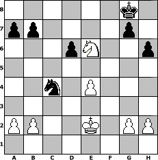Partie-Notation im PGN-Format [Event "Rechnerfrei B"] [Site "www.mySchach.de"] [Date "2010.02.07"] [Round "1"] [White "frankto"] [Black "BobbyF4"] [ECO "C40"] [WhitemyELO "1728"] [BlackmyELO "1563"] [Result "1/2-1/2"] [TimeControl "10/1728000"] [WhiteDays "39"] [BlackDays "63"] [MySchachNr "63009"] 1. e4 e5 2. Nf3 Bc5 3. Nc3 Nc6 4. Nxe5 Bxf2+ 5. Kxf2 Nxe5 6. d4 Ng6 7. Bc4 Nh6 8. Rf1 Qh4+ 9. Kg1 O-O 10. Qf3 d6 11. Bxh6 Qxh6 12. Bxf7+ Kh8 13. Qg3 Ne7 14. Bb3 Bd7 15. Rf2 c6 16. Raf1 Rxf2 17. Qxf2 Be6 18. d5 Bg8 19. dxc6 Nxc6 20. Bxg8 Rxg8 21. Qf8 Qe6 22. Nb5 h6 23. Qf5 Qe7 24. Nc3 Qh4 25. Nd5 Qd8 26. Qh5 Nd4 27. Nf6 Rf8 28. Nd5 Rxf1+ 29. Kxf1 Nxc2 30. Nf4 Qc8 31. Qf7 Ne3+ 32. Ke2 Nc4 33. Ne6 Qg8 34. Qxg8+ Kxg8 1/2-1/2 Stellungs-Notation im FEN-Format 6k1/pp4p1/3pN2p/8/2n1P3/8/PP2K1PP/8 - - - 0 35 Geschlagene Figuren Weiss: ![]() ![]() ![]() ![]() ![]() ![]() ![]() ![]() ![]() ![]() ![]() ![]() ![]() ![]() ![]() Geschlagene Figuren Schwarz: ![]() ![]() ![]() ![]() ![]() ![]() ![]() ![]() ![]() ![]() ![]() ![]() ![]() ![]() ![]() Klicken Sie auf eine geschlagene Figur um den gewünschten Zug darzustellen!