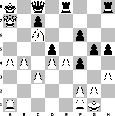 Partie-Notation im PGN-Format [Event "Energiekrise"] [Site "www.mySchach.de"] [Date "2022.10.29"] [Round "1"] [White "wolni55"] [Black "Mynona"] [ECO "C40"] [WhitemyELO "1512"] [BlackmyELO "1463"] [Result "1-0"] [TimeControl "10/1728000"] [WhiteDays "20"] [BlackDays "20"] [MySchachNr "127795"] 1. e4 e5 2. Nf3 f6 3. Bc4 Bc5 4. d3 Ne7 5. a4 a6 6. c3 Nbc6 7. O-O d6 8. Nh4 g5 9. Nf3 Bg4 10. h3 Bxf3 11. Qxf3 Ng6 12. Qh5 Qe7 13. b4 Ba7 14. Bd5 O-O-O 15. Qg4+ Kb8 16. Bxc6 bxc6 17. Na3 h5 18. Qe2 Nf4 19. Bxf4 exf4 20. Nc4 d5 21. Na5 Qe6 22. d4 Rde8 23. Qxa6 Qc8 24. Nxc6+ Ka8 25. Qxa7# 1-0 Stellungs-Notation im FEN-Format k1q1r2r/Q1p5/2N2p2/3p2pp/PP1PPp2/2P4P/5PP1/R4RK1 - - - 0 25 Geschlagene Figuren Weiss: Geschlagene Figuren Schwarz: Klicken Sie auf eine geschlagene Figur um den gewünschten Zug darzustellen!