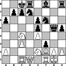 Partie-Notation im PGN-Format [Event "2. Norderstedter DENK MAL Open 2011"] [Site "www.mySchach.de"] [Date "2011.06.02"] [Round "1"] [White "Steppenwolf"] [Black "Winston"] [ECO "C41"] [WhitemyELO "1132"] [BlackmyELO "1443"] [Result "0-1"] [TimeControl "10/2592000"] [WhiteDays "30"] [BlackDays "30"] [MySchachNr "74268"] 1. e4 e5 2. Nf3 d6 3. Nc3 a6 4. Bc4 Be6 5. Bxe6 fxe6 6. O-O d5 7. Re1 Qd6 8. d3 Nd7 9. Bg5 d4 10. Ne2 h6 11. Bh4 g5 12. Bg3 O-O-O 13. c3 dxc3 14. bxc3 Ngf6 15. Nd2 h5 16. f3 Qxd3 17. Rc1 g4 18. Rf1 Qe3+ 19. Bf2 Qg5 20. Nc4 gxf3 0-1 Stellungs-Notation im FEN-Format 2kr1b1r/1ppn4/p3pn2/4p1qp/2N1P3/2P2p2/P3NBPP/2RQ1RK1 - - - 0 21 Geschlagene Figuren Weiss: ![]() ![]() ![]() ![]() ![]() ![]() ![]() ![]() ![]() ![]() ![]() ![]() ![]() ![]() ![]() Geschlagene Figuren Schwarz: ![]() ![]() ![]() ![]() ![]() ![]() ![]() ![]() ![]() ![]() ![]() ![]() ![]() ![]() ![]() Klicken Sie auf eine geschlagene Figur um den gewünschten Zug darzustellen!