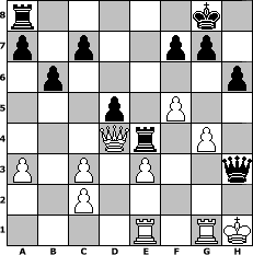 Partie-Notation im PGN-Format [Event "ONCE A PAWN A TIME"] [Site "www.mySchach.de"] [Date "2020.07.30"] [Round "1"] [White "lotchi"] [Black "spiderman"] [ECO "A05"] [WhitemyELO "1168"] [BlackmyELO "1837"] [Result "0-1"] [TimeControl "10/3456000"] [WhiteDays "40"] [BlackDays "34"] [MySchachNr "118949"] 1. Nf3 Nf6 2. Nc3 d5 3. d4 e6 4. Bg5 Bb4 5. a3 Bxc3+ 6. bxc3 h6 7. Bxf6 Qxf6 8. e3 O-O 9. Bd3 Nc6 10. O-O e5 11. dxe5 Nxe5 12. Nxe5 Qxe5 13. Qd2 Bf5 14. f4 Qe6 15. Bxf5 Qxf5 16. h3 Rfe8 17. Rae1 b6 18. g4 Qe6 19. f5 Qe5 20. Qd4 Qg3+ 21. Kh1 Qxh3+ 22. Kg1 Qg3+ 23. Kh1 Re4 24. Rg1 Qh3# 0-1 Stellungs-Notation im FEN-Format r5k1/p1p2pp1/1p5p/3p1P2/3Qr1P1/P1P1P2q/2P5/4R1RK - - - 6 25 Geschlagene Figuren Weiss: Geschlagene Figuren Schwarz: Klicken Sie auf eine geschlagene Figur um den gewünschten Zug darzustellen!