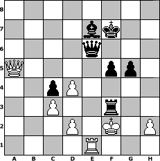 Partie-Notation im PGN-Format [Event "Mal wieder spielen 2"] [Site "www.mySchach.de"] [Date "2013.05.12"] [Round "1"] [White "Tomino"] [Black "Papale"] [ECO "A46"] [WhitemyELO "1690"] [BlackmyELO "1620"] [Result "0-1"] [TimeControl "10/1728000"] [WhiteDays "40"] [BlackDays "52"] [MySchachNr "88289"] 1. d4 Nf6 2. Nf3 d5 3. Bf4 Bf5 4. c4 dxc4 5. e3 b5 6. Nc3 c6 7. a4 Nd5 8. axb5 Nxc3 9. bxc3 cxb5 10. Be2 Nd7 11. O-O e6 12. Ne5 Nxe5 13. Bxe5 f6 14. Bg3 a5 15. Bf3 Ra7 16. Bc6+ Kf7 17. e4 Qb6 18. exf5 Qxc6 19. fxe6+ Qxe6 20. Qh5+ g6 21. Qxb5 h5 22. Rxa5 Rxa5 23. Qxa5 h4 24. Bf4 g5 25. Bc7 h3 26. gxh3 Rxh3 27. Bg3 f5 28. f3 Be7 29. Re1 Rxg3+ 30. Kf2 Rxf3+ 0-1 Stellungs-Notation im FEN-Format 8/4bk2/4q3/Q4pp1/2pP4/2P2r2/3P1K1P/4R3 - - - 0 31 Geschlagene Figuren Weiss: Geschlagene Figuren Schwarz: Klicken Sie auf eine geschlagene Figur um den gewünschten Zug darzustellen!