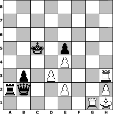 Partie-Notation im PGN-Format [Event "Sommerschach"] [Site "www.mySchach.de"] [Date "2018.05.26"] [Round "1"] [White "Gauss1233"] [Black "MiFie"] [ECO "C70"] [WhitemyELO "1398"] [BlackmyELO "1080"] [Result "0-1"] [TimeControl "10/2592000"] [WhiteDays "30"] [BlackDays "27"] [MySchachNr "112199"] 1. e4 e5 2. Nf3 Nc6 3. Bb5 a6 4. Ba4 b5 5. Bb3 Qe7 6. Nc3 Nf6 7. O-O b4 8. Nd5 Qd6 9. d3 Be7 10. Nxe7 Qxe7 11. Bg5 O-O 12. c3 h6 13. Bh4 a5 14. Re1 g5 15. Bg3 g4 16. Nh4 Qc5 17. cxb4 axb4 18. Rc1 Qb6 19. Nf5 Nd4 20. Nxh6+ Kg7 21. Nxg4 d6 22. Nxf6 Kxf6 23. Bh4+ Kg7 24. Qf3 Nxf3+ 25. gxf3 Rg8 26. Kh1 Rh8 27. Rg1+ Kf8 28. Bg3 Be6 29. Bxe6 fxe6 30. f4 exf4 31. Bxf4 Qxf2 32. Bg3 Qxb2 33. Rxc7 Rxa2 34. Bxd6+ Ke8 35. Rc8+ Kd7 36. Rxh8 Kxd6 37. Rh5 e5 38. Rh6+ Kc5 39. Rh3 b3 0-1 Stellungs-Notation im FEN-Format 8/8/8/2k1p3/4P3/1p1P3R/rq2P2P/6RK - - - 0 40 Geschlagene Figuren Weiss: Geschlagene Figuren Schwarz: Klicken Sie auf eine geschlagene Figur um den gewünschten Zug darzustellen!