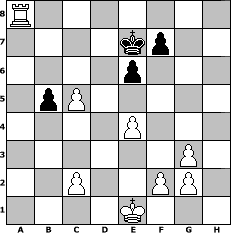 Partie-Notation im PGN-Format [Event "Sommer 2025_1"] [Site "www.mySchach.de"] [Date "2025.06.20"] [Round "1"] [White "Yukiki"] [Black "Lohl"] [ECO "D04"] [WhitemyELO "1575"] [BlackmyELO "1299"] [Result "1-0"] [TimeControl "10/1728000"] [WhiteDays "38"] [BlackDays "80"] [MySchachNr "133459"] 1. d4 d5 2. Nf3 Nf6 3. e3 c5 4. Ne5 Nbd7 5. Nxd7 Nxd7 6. Bb5 a6 7. Bxd7+ Bxd7 8. dxc5 e6 9. b4 Bb5 10. a4 Bc4 11. Nd2 b5 12. Nxc4 bxc4 13. a5 c3 14. Qd4 Be7 15. Qxg7 Bf6 16. Qg3 Bg5 17. e4 d4 18. Bxg5 Qb8 19. Bf6 Qxg3 20. hxg3 Rg8 21. Bxd4 Rd8 22. Bxc3 Rg6 23. b5 axb5 24. Rxh7 Ke7 25. a6 Rgg8 26. a7 Ra8 27. Rh8 Rxh8 28. Bxh8 Rxh8 29. a8=Q Rxa8 30. Rxa8 1-0 Stellungs-Notation im FEN-Format R7/4kp2/4p3/1pP5/4P3/6P1/2P2PP1/4K3 - - - 0 30 Geschlagene Figuren Weiss: Geschlagene Figuren Schwarz: Klicken Sie auf eine geschlagene Figur um den gewünschten Zug darzustellen!