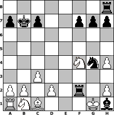 Partie-Notation im PGN-Format [Event "Rund ums K"] [Site "www.mySchach.de"] [Date "2004.09.28"] [Round "1"] [White "OwainGwynedd"] [Black "PeterLoskarn"] [ECO "C33"] [WhitemyELO "1211"] [BlackmyELO "1902"] [Result "0-1"] [TimeControl "10/2592000"] [WhiteDays "59"] [BlackDays "59"] [MySchachNr "7158"] 1. e4 e5 2. f4 exf4 3. Nh3 Qh4+ 4. Nf2 Nf6 5. Qf3 Nc6 6. c3 d5 7. exd5 Bg4 8. Qxf4 O-O-O 9. dxc6 Re8+ 10. Be2 Rxe2+ 11. Kf1 Bd6 12. cxb7+ Kxb7 13. g3 Bxf4 14. gxh4 Bf3 15. Nh3 Ng4 16. Nxf4 Rf2+ 17. Kg1 Bxh1 0-1 Stellungs-Notation im FEN-Format 7r/pkp2ppp/8/8/5NnP/2P5/PP1P1r1P/RNB3Kb - - - 0 18 Geschlagene Figuren Weiss: ![]() ![]() ![]() ![]() ![]() ![]() ![]() ![]() ![]() ![]() ![]() ![]() ![]() ![]() ![]() Geschlagene Figuren Schwarz: ![]() ![]() ![]() ![]() ![]() ![]() ![]() ![]() ![]() ![]() ![]() ![]() ![]() ![]() ![]() Klicken Sie auf eine geschlagene Figur um den gewünschten Zug darzustellen!