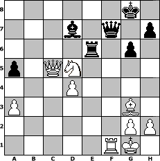 Partie-Notation im PGN-Format [Event "Vereinsmeisterschaft YUGZ 2008-2009"] [Site "www.mySchach.de"] [Date "2008.12.15"] [Round "2"] [White "Flang"] [Black "carlo"] [ECO "A00"] [WhitemyELO "1431"] [BlackmyELO "1585"] [Result "1-0"] [TimeControl "10/2592000"] [WhiteDays "105"] [BlackDays "107"] [MySchachNr "50733"] 1. b4 e6 2. Bb2 Nc6 3. b5 Ne5 4. Bxe5 d6 5. Bg3 c6 6. e4 a5 7. d4 f5 8. Nc3 d5 9. exf5 Bb4 10. Qd3 Nf6 11. Bh4 Qd6 12. a3 Bxc3+ 13. Qxc3 exf5 14. Bd3 Qe6+ 15. Ne2 Bd7 16. O-O Ne4 17. Qe1 O-O 18. Ng3 g6 19. Bxe4 fxe4 20. bxc6 bxc6 21. Ne2 Rf7 22. Qc1 Qd6 23. Bg3 Qe7 24. c4 e3 25. fxe3 Raf8 26. Rxf7 Qxf7 27. Nf4 Re8 28. cxd5 cxd5 29. Qc5 Rxe3 30. Nxd5 Re6 31. Rf1 1-0 Stellungs-Notation im FEN-Format 6k1/3b1q1p/4r1p1/p1QN4/3P4/P5B1/6PP/5RK1 - - - 2 31 Geschlagene Figuren Weiss: Geschlagene Figuren Schwarz: Klicken Sie auf eine geschlagene Figur um den gewünschten Zug darzustellen!