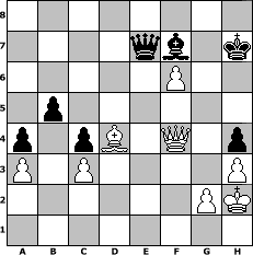 Partie-Notation im PGN-Format [Event "Turnier gegen Regen :>"] [Site "www.mySchach.de"] [Date "2006.09.04"] [Round "2"] [White "Phantasos"] [Black "Caligula"] [ECO "D02"] [WhitemyELO "2060"] [BlackmyELO "1829"] [Result "1-0"] [TimeControl "10/1728000"] [WhiteDays "119"] [BlackDays "136"] [MySchachNr "28154"] 1. d4 d5 2. Nf3 e6 3. c4 Nf6 4. Nc3 Be7 5. Bg5 Nc6 6. e3 O-O 7. Rc1 h6 8. Bh4 Re8 9. Bd3 Nb4 10. Be2 dxc4 11. O-O Nbd5 12. Bxc4 Nxc3 13. bxc3 b6 14. Bb5 Bd7 15. Bd3 Bc8 16. Bg3 Ba3 17. Rb1 Bb7 18. Ne5 Bd6 19. Qc2 Rc8 20. Rfd1 Qe7 21. Bh4 c5 22. Bh7+ Kh8 23. Bg6 Rf8 24. Bxf7 Bxe5 25. dxe5 Qxf7 26. exf6 gxf6 27. f3 Rg8 28. Bg3 Bc6 29. Rd6 Qe7 30. Rd1 Rg5 31. e4 c4 32. Bf4 Rg6 33. Kh1 Kh7 34. Qb1 Be8 35. Be3 Qf7 36. R1d2 f5 37. Qd1 Rc7 38. exf5 Qxf5 39. Rd8 Rg8 40. R2d4 Qf6 41. Qe1 Qg6 42. Rg4 Qf6 43. Rxg8 Qxd8 44. Rf8 Qe7 45. Qg3 Bg6 46. Qf4 Qg7 47. Bd4 e5 48. Bxe5 Re7 49. Rf6 Rf7 50. Kg1 b5 51. a3 Rxf6 52. Bxf6 Qd7 53. Bd4 Qe7 54. h3 a5 55. Qb8 Be8 56. f4 h5 57. f5 h4 58. Kh2 a4 59. Qf4 Bf7 60. f6 1-0 Stellungs-Notation im FEN-Format 8/4qb1k/5P2/1p6/p1pB1Q1p/P1P4P/6PK/8 - - - 0 60 Geschlagene Figuren Weiss: Geschlagene Figuren Schwarz: Klicken Sie auf eine geschlagene Figur um den gewünschten Zug darzustellen!