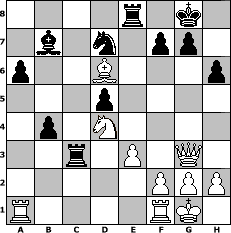 Partie-Notation im PGN-Format [Event "R"] [Site "www.mySchach.de"] [Date "2005.07.20"] [Round "2"] [White "Dragonwolves"] [Black "Baehr008"] [ECO "D02"] [WhitemyELO "2042"] [BlackmyELO "1905"] [Result "1-0"] [TimeControl "10/2592000"] [WhiteDays "89"] [BlackDays "90"] [MySchachNr "15277"] 1. d4 d5 2. Nf3 Nf6 3. c4 e6 4. Nc3 Be7 5. Bg5 O-O 6. e3 h6 7. Bh4 b6 8. Be2 Bb7 9. Rc1 Nbd7 10. cxd5 exd5 11. Nd2 c5 12. O-O Rc8 13. Bg3 a6 14. Bd3 Re8 15. Qf3 b5 16. Bf5 b4 17. Ne2 Qa5 18. Nc4 Qxa2 19. Nd6 Bxd6 20. Bxd6 cxd4 21. Ra1 Qb3 22. Nxd4 Qc3 23. bxc3 Rxc3 24. Bxd7 Nxd7 25. Qg3 1-0 Stellungs-Notation im FEN-Format 4r1k1/1b1n1pp1/p2B3p/3p4/1p1N4/2r1P1Q1/5PPP/R4RK1 - - - 1 25 Geschlagene Figuren Weiss: Geschlagene Figuren Schwarz: Klicken Sie auf eine geschlagene Figur um den gewünschten Zug darzustellen!