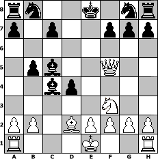 Partie-Notation im PGN-Format [Event "Bauer56-Turnier-1"] [Site "www.mySchach.de"] [Date "2012.02.17"] [Round "1"] [White "Helmut48"] [Black "Bauer56"] [ECO "C21"] [WhitemyELO "1883"] [BlackmyELO "1497"] [Result "1-0"] [TimeControl "10/1728000"] [WhiteDays "20"] [BlackDays "20"] [MySchachNr "79964"] 1. e4 e5 2. d4 d5 3. Nd2 exd4 4. exd5 Qxd5 5. Ngf3 Bg4 6. Bc4 Bxf3 7. Bxd5 Bxd5 8. Nf3 Bb4+ 9. Bd2 Bc5 10. c4 Bxc4 11. Qc2 b5 12. Qf5 1-0 Stellungs-Notation im FEN-Format rn2k1nr/p1p2ppp/8/1pb2Q2/2bp4/5N2/PP1BPPPP/R3K2R - KQkq - 1 12 Geschlagene Figuren Weiss: Geschlagene Figuren Schwarz: Klicken Sie auf eine geschlagene Figur um den gewünschten Zug darzustellen!