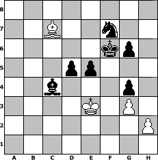Partie-Notation im PGN-Format [Event "French Open"] [Site "www.mySchach.de"] [Date "2007.06.02"] [Round "1"] [White "Andylein1989"] [Black "bernhard"] [ECO "C41"] [WhitemyELO "1546"] [BlackmyELO "1577"] [Result "0-1"] [TimeControl "10/864000"] [WhiteDays "38"] [BlackDays "39"] [MySchachNr "35382"] 1. e4 e5 2. Nf3 d6 3. Bc4 f5 4. d3 h6 5. Nc3 Nf6 6. Nh4 f4 7. Ng6 Rh7 8. Bg8 Nxg8 9. Nxf8 Kxf8 10. Qh5 Qg5 11. Qxg5 hxg5 12. Nd5 Na6 13. g3 c6 14. Nc3 fxg3 15. fxg3 g4 16. Bg5 g6 17. O-O+ Rf7 18. Rxf7+ Kxf7 19. Rf1+ Kg7 20. Bd8 Be6 21. Bg5 Nb4 22. Rf2 Nxa2 23. Nxa2 Bxa2 24. b3 Bb1 25. Rd2 a5 26. c4 a4 27. bxa4 Rxa4 28. Rd1 Bc2 29. Rd2 Ra2 30. Bd8 Bb3 31. Rxa2 Bxa2 32. Kf1 Nh6 33. Bc7 Nf7 34. Ke2 b5 35. Ba5 bxc4 36. dxc4 Bxc4+ 37. Ke3 d5 38. exd5 cxd5 39. Bc7 Kf6 0-1 Stellungs-Notation im FEN-Format 8/2B2n2/5kp1/3pp3/2b3p1/4K1P1/7P/8 - - - 2 40 Geschlagene Figuren Weiss: Geschlagene Figuren Schwarz: Klicken Sie auf eine geschlagene Figur um den gewünschten Zug darzustellen!