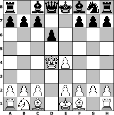 Partie-Notation im PGN-Format [Event "Spa"] [Site "www.mySchach.de"] [Date "2009.07.08"] [Round "1"] [White "scherry"] [Black "Steppenwolf"] [ECO "C45"] [WhitemyELO "1262"] [BlackmyELO "1210"] [Result "0-1"] [TimeControl "10/2592000"] [WhiteDays "00"] [BlackDays "27"] [MySchachNr "57263"] 1. e4 e5 2. Nf3 Nc6 3. d4 exd4 4. Nxd4 Nxd4 5. Qxd4 d6 0-1 Stellungs-Notation im FEN-Format r1bqkbnr/ppp2ppp/3p4/8/3QP3/8/PPP1PPPP/RNB1KB1R - KQkq - 0 6 Geschlagene Figuren Weiss: Geschlagene Figuren Schwarz: Klicken Sie auf eine geschlagene Figur um den gewünschten Zug darzustellen!
