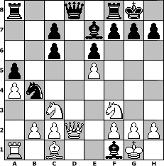 Partie-Notation im PGN-Format [Event "Turnier zum Tag der deutschen Einheit 2015"] [Site "www.mySchach.de"] [Date "2015.10.03"] [Round "1"] [White "paul"] [Black "ndziemba"] [ECO "A04"] [WhitemyELO "1348"] [BlackmyELO "1407"] [Result "0-1"] [TimeControl "10/1728000"] [WhiteDays "00"] [BlackDays "39"] [MySchachNr "100632"] 1. Nf3 e6 2. e4 Be7 3. Nc3 Nc6 4. Bb5 a6 5. Bxc6 bxc6 6. O-O Nf6 7. d3 O-O 8. e5 Nd5 9. Qd2 d6 10. d4 a5 11. a4 Nb4 12. Qe2 Ba6 13. Qd2 dxe5 14. dxe5 Bxf1 0-1 Stellungs-Notation im FEN-Format r2q1rk1/2p1bppp/2p1p3/p3P3/Pn6/2N2N2/1PPQ1PPP/R1B2bK1 - - - 0 15 Geschlagene Figuren Weiss: Geschlagene Figuren Schwarz: Klicken Sie auf eine geschlagene Figur um den gewünschten Zug darzustellen!