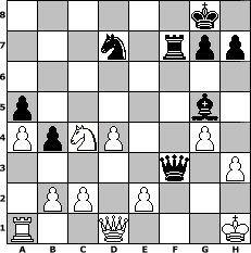 Partie-Notation im PGN-Format [Event "Herbst 2016"] [Site "www.mySchach.de"] [Date "2016.09.13"] [Round "1"] [White "Knight"] [Black "beowulf"] [ECO "B30"] [WhitemyELO "1133"] [BlackmyELO "1334"] [Result "0-1"] [TimeControl "10/1728000"] [WhiteDays "80"] [BlackDays "45"] [MySchachNr "104942"] 1. e4 c5 2. Nf3 Nc6 3. Bc4 d6 4. O-O Bg4 5. Nc3 Nf6 6. d3 e6 7. Bg5 Be7 8. Be3 O-O 9. Re1 Nd4 10. Bxd4 cxd4 11. Nb1 a6 12. Nbd2 b5 13. Bb3 a5 14. a3 d5 15. e5 Nd7 16. a4 b4 17. h3 Bh5 18. g4 Bg6 19. Nxd4 Bg5 20. f3 f6 21. exf6 Rxf6 22. Nxe6 Qb6+ 23. d4 Rxe6 24. Rxe6 Qxe6 25. Ba2 Qe3+ 26. Kh1 Rf8 27. Bxd5+ Bf7 28. Bxf7+ Rxf7 29. Nc4 Qxf3+ 0-1 Stellungs-Notation im FEN-Format 6k1/3n1rpp/8/p5b1/PpNP2P1/5q1P/1PP1P3/R2Q3K - - - 0 30 Geschlagene Figuren Weiss: ![]() ![]() ![]() ![]() ![]() ![]() ![]() ![]() ![]() ![]() ![]() ![]() ![]() ![]() ![]() Geschlagene Figuren Schwarz: ![]() ![]() ![]() ![]() ![]() ![]() ![]() ![]() ![]() ![]() ![]() ![]() ![]() ![]() ![]() Klicken Sie auf eine geschlagene Figur um den gewünschten Zug darzustellen!
