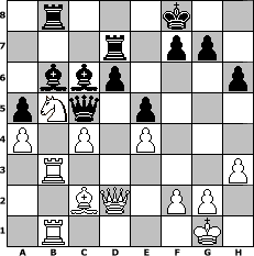 Partie-Notation im PGN-Format [Event "Winter 2011/12"] [Site "www.mySchach.de"] [Date "2011.12.22"] [Round "2"] [White "Grubengeist"] [Black "HPB2005"] [ECO "B45"] [WhitemyELO "1843"] [BlackmyELO "1936"] [Result "1/2-1/2"] [TimeControl "10/2592000"] [WhiteDays "99"] [BlackDays "84"] [MySchachNr "78387"] 1. e4 c5 2. Nf3 e6 3. d4 cxd4 4. Nxd4 Nc6 5. Nc3 Nf6 6. Bf4 d6 7. Ndb5 e5 8. Bg5 a6 9. Na3 b5 10. Nd5 Be7 11. Bxf6 Bxf6 12. c3 Bg5 13. Nc2 Rb8 14. Be2 O-O 15. O-O a5 16. Na3 b4 17. Nb5 bxc3 18. bxc3 Ne7 19. Nxe7+ Bxe7 20. a4 Qb6 21. c4 Bd7 22. Rc1 Bc6 23. Bd3 Qc5 24. Qd2 Bd8 25. Rfd1 h6 26. Rb1 Bb6 27. Rb3 Rfc8 28. Rdb1 Re8 29. Nc3 Ba7 30. Nb5 Red8 31. h3 Rd7 32. Bc2 Bb6 33. Rg3 Kf8 34. Rgb3 1/2-1/2 Stellungs-Notation im FEN-Format 1r3k2/3r1pp1/1bbp3p/pNq1p3/P1P1P3/1R5P/2BQ1PP1/1R4K1 - - - 6 34 Geschlagene Figuren Weiss: Geschlagene Figuren Schwarz: Klicken Sie auf eine geschlagene Figur um den gewünschten Zug darzustellen!