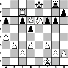 Partie-Notation im PGN-Format [Event "Dabei ist alles 6"] [Site "www.mySchach.de"] [Date "2009.03.21"] [Round "1"] [White "brucybabe"] [Black "beowulf"] [ECO "C85"] [WhitemyELO "1620"] [BlackmyELO "1354"] [Result "1-0"] [TimeControl "10/864000"] [WhiteDays "10"] [BlackDays "10"] [MySchachNr "54085"] 1. e4 e5 2. Nf3 Nc6 3. Bb5 a6 4. Ba4 Nf6 5. O-O Be7 6. Bxc6 bxc6 7. Nxe5 Nxe4 8. Qg4 Ng5 9. Qe2 O-O 10. Re1 Bb7 11. Nxc6 Bxc6 12. Qxe7 Qxe7 13. Rxe7 Rfe8 14. Rxe8+ Rxe8 15. Kf1 Be4 16. d3 Bc6 17. Bxg5 Ba4 18. b3 Bc6 19. Nc3 Bb7 20. f3 f6 21. Bd2 Kf7 22. Re1 Rd8 23. a4 c6 24. Ne4 d5 25. Nc5 Bc8 26. Ba5 Rf8 27. Bc7 g6 28. Bd6 Rg8 29. Re7+ Kf8 30. Rc7+ Ke8 31. Rxc8+ Kf7 32. Rc7+ Ke8 33. Ne6 1-0 Stellungs-Notation im FEN-Format 4k1r1/2R4p/p1pBNpp1/3p4/P7/1P1P1P2/2P3PP/5K2 - - - 4 33 Geschlagene Figuren Weiss: Geschlagene Figuren Schwarz: Klicken Sie auf eine geschlagene Figur um den gewünschten Zug darzustellen!
