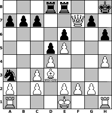Partie-Notation im PGN-Format [Event "Weihnachtsturnier 2012"] [Site "www.mySchach.de"] [Date "2012.12.18"] [Round "1"] [White "Haki"] [Black "Wulfen49"] [ECO "C16"] [WhitemyELO "1100"] [BlackmyELO "1263"] [Result "1-0"] [TimeControl "10/864000"] [WhiteDays "10"] [BlackDays "10"] [MySchachNr "85564"] 1. e4 e6 2. d4 d5 3. Nc3 Bb4 4. e5 Ne7 5. Nf3 O-O 6. Bd3 Bxc3+ 7. bxc3 Ng6 8. Ba3 Re8 9. h4 Nf4 10. Bf1 Bd7 11. Qc1 Nc6 12. Qxf4 Na5 13. Ng5 Nc4 14. Qxf7+ Kh8 15. Qh5 h6 16. Nf7+ Kh7 17. Nxd8 Nxa3 18. Bd3+ Kg8 19. Qf7+ Kh8 20. Qxd7 Raxd8 21. Qf7 1-0 Stellungs-Notation im FEN-Format 3rr2k/ppp2Qp1/4p2p/3pP3/3P3P/n1PB4/P1P1PPP1/R3K2R - KQ - 1 21 Geschlagene Figuren Weiss: Geschlagene Figuren Schwarz: Klicken Sie auf eine geschlagene Figur um den gewünschten Zug darzustellen!