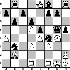 Partie-Notation im PGN-Format [Event "Energiekrise"] [Site "www.mySchach.de"] [Date "2022.10.29"] [Round "1"] [White "Hobbykegler"] [Black "faustballer"] [ECO "A10"] [WhitemyELO "1144"] [BlackmyELO "1560"] [Result "0-1"] [TimeControl "10/1728000"] [WhiteDays "20"] [BlackDays "20"] [MySchachNr "127779"] 1. c4 b6 2. b3 e5 3. Bb2 d6 4. Qc2 Bb7 5. f3 Nc6 6. a3 Nf6 7. Nh3 h6 8. g4 Ne7 9. Bg2 Rb8 10. Nc3 Nxg4 11. O-O Nf6 12. Nf2 Nc6 13. e4 Nd4 14. a4 Nxc2 15. Rac1 Nd4 16. d3 Nxb3 17. Rcd1 Nh5 18. Nd5 Bxd5 19. cxd5 Nf4 20. Bh1 Qg5+ 21. Ng4 h5 0-1 Stellungs-Notation im FEN-Format 1r2kb1r/p1p2pp1/1p1p4/3Pp1qp/P3PnN1/1n1P1P2/1B5P/3R1RKB - k - 0 22 Geschlagene Figuren Weiss: Geschlagene Figuren Schwarz: Klicken Sie auf eine geschlagene Figur um den gewünschten Zug darzustellen!
