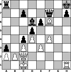 Partie-Notation im PGN-Format [Event "Bis1400"] [Site "www.mySchach.de"] [Date "2009.06.21"] [Round "1"] [White "Caligula"] [Black "Knight"] [ECO "D02"] [WhitemyELO "1294"] [BlackmyELO "1134"] [Result "1-0"] [TimeControl "10/2592000"] [WhiteDays "120"] [BlackDays "117"] [MySchachNr "56787"] 1. d4 d5 2. Nf3 Nc6 3. e3 Nf6 4. Bb5 Bg4 5. Bxc6+ bxc6 6. c3 e6 7. h3 Bh5 8. g4 Bg6 9. Nbd2 Ne4 10. Nxe4 Bxe4 11. Rg1 Bd6 12. Ne5 Bxe5 13. f3 Bd3 14. Qxd3 Bd6 15. Bd2 O-O 16. O-O-O g6 17. Rh1 a5 18. h4 c5 19. g5 c4 20. Qc2 f5 21. gxf6 Qxf6 22. f4 a4 23. Rdg1 Rf7 24. h5 Rg7 25. hxg6 Rxg6 26. Be1 Rxg1 27. Rxg1+ Kh8 28. Rh1 Qf7 29. Bh4 a3 30. Bf6+ 1-0 Stellungs-Notation im FEN-Format r6k/2p2q1p/3bpB2/3p4/2pP1P2/p1P1P3/PPQ5/2K4R - - - 1 30 Geschlagene Figuren Weiss: Geschlagene Figuren Schwarz: Klicken Sie auf eine geschlagene Figur um den gewünschten Zug darzustellen!