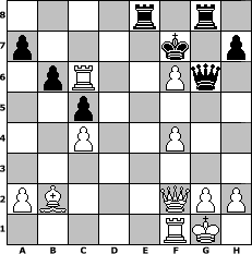 Partie-Notation im PGN-Format [Event "Wrixum - Open die XII"] [Site "www.mySchach.de"] [Date "2014.10.09"] [Round "1"] [White "pepo47"] [Black "Naunhofer"] [ECO "A46"] [WhitemyELO "2068"] [BlackmyELO "1594"] [Result "1-0"] [TimeControl "10/2592000"] [WhiteDays "89"] [BlackDays "86"] [MySchachNr "96297"] 1. d4 Nf6 2. Nf3 e6 3. e3 d5 4. Bd3 c5 5. b3 Nc6 6. O-O Be7 7. Bb2 b6 8. Ne5 Bb7 9. Nxc6 Bxc6 10. Nd2 O-O 11. Nf3 Ne4 12. c4 dxc4 13. Bxc4 Bf6 14. Qe2 Qe7 15. Ne5 Bxe5 16. dxe5 f6 17. f3 Ng5 18. exf6 gxf6 19. f4 Nf7 20. e4 Rae8 21. Rae1 Nd6 22. e5 Nxc4 23. exf6 Qf7 24. bxc4 Qg6 25. Qf2 Kf7 26. Rxe6 Rg8 27. Rxc6 1-0 Stellungs-Notation im FEN-Format 4r1r1/p4k1p/1pR2Pq1/2p5/2P2P2/8/PB3QPP/5RK1 - - - 0 27 Geschlagene Figuren Weiss: Geschlagene Figuren Schwarz: Klicken Sie auf eine geschlagene Figur um den gewünschten Zug darzustellen!