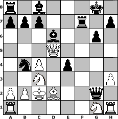 Partie-Notation im PGN-Format [Event "Abermals Aljechin"] [Site "www.mySchach.de"] [Date "2011.02.13"] [Round "2"] [White "muellerh"] [Black "Svetlana"] [ECO "A52"] [WhitemyELO "1531"] [BlackmyELO "1586"] [Result "0-1"] [TimeControl "10/1728000"] [WhiteDays "08"] [BlackDays "32"] [MySchachNr "71999"] 1. d4 Nf6 2. c4 e5 3. dxe5 Ng4 4. e4 d6 5. exd6 Bxd6 6. Be2 f5 7. h3 Nxf2 8. Kxf2 Qh4+ 9. Kf1 fxe4 10. Bh5+ g6 11. Qd4 O-O+ 12. Ke2 Qxh5+ 13. Kd2 Qg5+ 14. Kc2 Qxg2+ 15. Bd2 Nc6 16. Qd5+ Rf7 17. Nc3 Nb4+ 0-1 Stellungs-Notation im FEN-Format r1b3k1/ppp2r1p/3b2p1/3Q4/1nP1p3/2N4P/PPKB2q1/R5NR - - - 6 18 Geschlagene Figuren Weiss: Geschlagene Figuren Schwarz: Klicken Sie auf eine geschlagene Figur um den gewünschten Zug darzustellen!