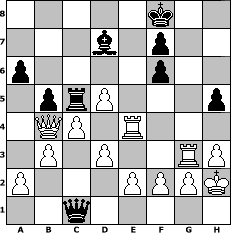 Partie-Notation im PGN-Format [Event "Turnier f"] [Site "www.mySchach.de"] [Date "2008.08.21"] [Round "1"] [White "MStr"] [Black "Schmalte"] [ECO "C62"] [WhitemyELO "1452"] [BlackmyELO "1473"] [Result "1-0"] [TimeControl "10/2592000"] [WhiteDays "75"] [BlackDays "78"] [MySchachNr "47271"] 1. e4 e5 2. Nf3 Nc6 3. Bb5 d6 4. h3 Nf6 5. d3 a6 6. Bxc6+ bxc6 7. O-O Be7 8. Nc3 O-O 9. Bg5 Nd7 10. Be3 Nb6 11. Qd2 d5 12. Nxe5 Bf6 13. Nxc6 Qd6 14. Bxb6 cxb6 15. exd5 Bd7 16. Ne4 Qc7 17. Nxf6+ gxf6 18. Qc3 Qd6 19. Rfe1 Kg7 20. Ne7 Rac8 21. Nxc8 Rxc8 22. Qb3 Rc5 23. c4 b5 24. Qc3 Qf4 25. Re4 Qf5 26. b3 h5 27. Re1 Qg5 28. R1e3 Qh6 29. Rg3+ Kf8 30. Qb4 Qc1+ 31. Kh2 1-0 Stellungs-Notation im FEN-Format 5k2/3b1p2/p4p2/1prP3p/1QP1R3/1P1P2RP/P3PPPK/2q5 - - - 9 31 Geschlagene Figuren Weiss: ![]() ![]() ![]() ![]() ![]() ![]() ![]() ![]() ![]() ![]() ![]() ![]() ![]() ![]() ![]() Geschlagene Figuren Schwarz: ![]() ![]() ![]() ![]() ![]() ![]() ![]() ![]() ![]() ![]() ![]() ![]() ![]() ![]() ![]() Klicken Sie auf eine geschlagene Figur um den gewünschten Zug darzustellen!