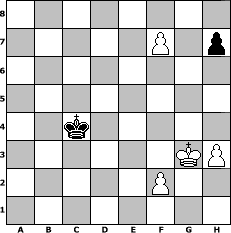 Partie-Notation im PGN-Format [Event "YOUR LAST BREATH"] [Site "www.mySchach.de"] [Date "2019.11.17"] [Round "2"] [White "iamnothere"] [Black "augustus"] [ECO "A06"] [WhitemyELO "1432"] [BlackmyELO "1155"] [Result "1-0"] [TimeControl "10/3456000"] [WhiteDays "39"] [BlackDays "39"] [MySchachNr "116359"] 1. Nf3 d5 2. e3 Bg4 3. h3 Bxf3 4. Qxf3 Nf6 5. c4 e6 6. cxd5 Nxd5 7. Bc4 c6 8. Nc3 b5 9. Bb3 Bb4 10. O-O Ba5 11. e4 Nxc3 12. dxc3 O-O 13. Rd1 Qe7 14. Be3 Nd7 15. a4 Ne5 16. Qe2 f5 17. axb5 Bc7 18. Rxa7 c5 19. Bxe6+ Qxe6 20. Rxc7 fxe4 21. Rxc5 Rf6 22. Rxe5 Qxe5 23. Bd4 Qf5 24. Bxf6 Re8 25. Qc4+ Kf8 26. Bxg7+ Kxg7 27. Qc7+ Kh8 28. Rd8 Rxd8 29. Qxd8+ Kg7 30. b6 e3 31. Qd4+ Kf7 32. Qxe3 Qb1+ 33. Kh2 Qxb2 34. b7 Qxb7 35. Qf3+ Qxf3 36. gxf3 Ke6 37. Kg3 Kd5 38. f4 Kc4 39. f5 Kxc3 40. f6 Kc4 41. f7 1-0 Stellungs-Notation im FEN-Format 8/5P1p/8/8/2k5/6KP/5P2/8 - - - 0 41 Geschlagene Figuren Weiss: Geschlagene Figuren Schwarz: Klicken Sie auf eine geschlagene Figur um den gewünschten Zug darzustellen!