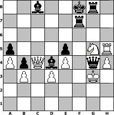 Partie-Notation im PGN-Format [Event "2.MySchach-960-Mannschaftsturnier 2014"] [Site "www.mySchach.de"] [Date "2014.02.18"] [Round "2"] [Board "3"] [White "Knight"] [Black "Winston"] [Variant "Fischerrandom"] [SetUp "1"] [FEN "bbqnnrkr/pppppppp/8/8/8/8/PPPPPPPP/BBQNNRKR w KQkq - 0 1"] [WhitemyELO "1222"] [BlackmyELO "1450"] [Result "0-1"] [TimeControl "10/3456000"] [WhiteDays "40"] [BlackDays "40"] [MySchachNr "93011"] 1. b3 Nf6 2. d3 d6 3. e4 h6 4. f4 a6 5. f5 Ng4 6. h3 Ba7+ 7. Rf2 Nxf2 8. Nxf2 b5 9. Qb2 f6 10. g4 b4 11. h4 e5 12. g5 Bd4 13. Qc1 Bxa1 14. gxh6 gxh6 15. Rh2 Rf7 16. Rg2+ Kf8 17. c4 Bc3 18. Nf3 h5 19. a3 a5 20. a4 d5 21. cxd5 Nb7 22. Nh3 Nd6 23. Nfg5 fxg5 24. Rxg5 c6 25. dxc6 Qxc6 26. Qf1 Qc5+ 27. Kh1 Ne8 28. Qe2 Nf6 29. Bc2 Bb7 30. Kh2 Ng4+ 31. Kg3 Bd4 32. f6 Nxf6 33. Qg2 Ng4 34. Bd1 Ne3 35. Qh1 Nxd1 36. Qxd1 Qc8 37. Rxh5 Rg8+ 38. Ng5 Qd7 39. Qc2 Bc8 40. Qc4 Qg4+ 0-1 Stellungs-Notation im FEN-Format 2b2kr1/5r2/8/p3p1NR/PpQbP1qP/1P1P2K1/8/8 - - - 7 41 Geschlagene Figuren Weiss: Geschlagene Figuren Schwarz: Klicken Sie auf eine geschlagene Figur um den gewünschten Zug darzustellen!