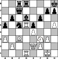 Partie-Notation im PGN-Format [Event "Pfingsturnier"] [Site "www.mySchach.de"] [Date "2019.05.31"] [Round "2"] [White "Erich"] [Black "Helmut48"] [ECO "E12"] [WhitemyELO "2072"] [BlackmyELO "2079"] [Result "1-0"] [TimeControl "10/2592000"] [WhiteDays "79"] [BlackDays "81"] [MySchachNr "115124"] 1. d4 Nf6 2. c4 e6 3. Nf3 b6 4. a3 Bb7 5. Nc3 d5 6. cxd5 Nxd5 7. Bd2 Nd7 8. e3 Nxc3 9. Bxc3 Bd6 10. Bd3 O-O 11. O-O c5 12. Bc2 Qe7 13. e4 cxd4 14. Qxd4 e5 15. Qe3 Rac8 16. Rfd1 Rfd8 17. Rd2 Nc5 18. Rad1 Ne6 19. Qe2 f6 20. g3 Kh8 21. h4 Qc7 22. Bb3 Nc5 23. Bd5 Bxd5 24. Rxd5 a5 25. h5 1-0 Stellungs-Notation im FEN-Format 2rr3k/2q3pp/1p1b1p2/p1nRp2P/4P3/P1B2NP1/1P2QP2/3R2K1 - - - 0 25 Geschlagene Figuren Weiss: Geschlagene Figuren Schwarz: Klicken Sie auf eine geschlagene Figur um den gewünschten Zug darzustellen!