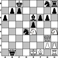 Partie-Notation im PGN-Format [Event "MySchachOpen"] [Site "www.mySchach.de"] [Date "2005.01.22"] [Round "1"] [White "Knight"] [Black "UPS"] [ECO "D00"] [WhitemyELO "1152"] [BlackmyELO "1638"] [Result "0-1"] [TimeControl "10/2592000"] [WhiteDays "90"] [BlackDays "89"] [MySchachNr "9894"] 1. d4 d5 2. e4 dxe4 3. Nc3 e6 4. f3 exf3 5. Qxf3 Qxd4 6. Be3 Qe5 7. O-O-O a6 8. Bd4 Qg5+ 9. Kb1 Nc6 10. Be3 Qf5 11. Qg3 Qa5 12. Nf3 g6 13. Bg5 f6 14. Bf4 e5 15. Re1 Be6 16. Bd2 O-O-O 17. b3 Bb4 18. Nh4 Rxd2 19. Ne4 Rxc2 20. Kxc2 Qxa2+ 21. Kd3 Qxb3+ 22. Ke2 Nd4+ 23. Kf2 Bxe1+ 24. Kxe1 Qb1+ 0-1 Stellungs-Notation im FEN-Format 2k3nr/1pp4p/p3bpp1/4p3/3nN2N/6Q1/6PP/1q2KB1R - - - 1 25 Geschlagene Figuren Weiss: Geschlagene Figuren Schwarz: Klicken Sie auf eine geschlagene Figur um den gewünschten Zug darzustellen!