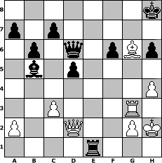 Partie-Notation im PGN-Format [Event "Frauentagsturnier"] [Site "www.mySchach.de"] [Date "2010.03.08"] [Round "1"] [White "werderfan"] [Black "Greenhorn"] [ECO "D57"] [WhitemyELO "1551"] [BlackmyELO "1579"] [Result "1-0"] [TimeControl "10/2592000"] [WhiteDays "118"] [BlackDays "088"] [MySchachNr "63814"] 1. d4 d5 2. c4 e6 3. Nc3 Nf6 4. Bg5 Be7 5. e3 O-O 6. Nf3 h6 7. Bh4 Ne4 8. Bxe7 Qxe7 9. cxd5 Nxc3 10. bxc3 exd5 11. Bd3 Nc6 12. O-O Re8 13. Qc2 Bg4 14. Nd2 Qd6 15. h3 Bd7 16. Rfe1 Re6 17. e4 Rae8 18. e5 Qa3 19. Rab1 b6 20. f4 R6e7 21. f5 f6 22. Nf3 fxe5 23. dxe5 Nxe5 24. Nxe5 Rxe5 25. Rxe5 Rxe5 26. f6 gxf6 27. Bh7+ Kh8 28. Rf1 Qf8 29. Bg6 Kg7 30. h4 Bb5 31. Rf3 Re1+ 32. Kh2 Qd6+ 33. Rg3 Kh8 34. Qd2 1-0 Stellungs-Notation im FEN-Format 7k/p1p5/1p1q1pBp/1b1p4/7P/2P3R1/P2Q2PK/4r3 - - - 8 34 Geschlagene Figuren Weiss: Geschlagene Figuren Schwarz: Klicken Sie auf eine geschlagene Figur um den gewünschten Zug darzustellen!