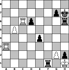 Partie-Notation im PGN-Format [Event "Festive 23"] [Site "www.mySchach.de"] [Date "2023.12.24"] [Round "1"] [White "Andreas1954"] [Black "Hobbykegler"] [ECO "C20"] [WhitemyELO "1235"] [BlackmyELO "1133"] [Result "0-1"] [TimeControl "10/2592000"] [WhiteDays "29"] [BlackDays "30"] [MySchachNr "131275"] 1. e4 e5 2. d3 Nc6 3. c4 Bc5 4. Be3 Bxe3 5. fxe3 Nf6 6. a3 O-O 7. Nc3 Qe7 8. b4 a5 9. b5 Nb4 10. axb4 Qxb4 11. Qc2 Ng4 12. Rb1 Qc5 13. Nd1 Nxe3 14. Nxe3 Qxe3+ 15. Qe2 Qd4 16. Nf3 Qc3+ 17. Qd2 Qa3 18. Qb2 Qxb2 19. Rxb2 d6 20. Be2 f5 21. h4 fxe4 22. dxe4 Be6 23. Kf2 Bg4 24. Ra1 b6 25. Kg3 h5 26. Ng5 Rf4 27. Bxg4 Rxg4+ 28. Kh3 Rf8 29. Ra3 Rff4 30. Nf3 Rxe4 31. Rbb3 Rxc4 32. Rc3 Rb4 33. Rab3 Rbe4 34. Ng5 Rxh4+ 35. Kg3 Reg4+ 36. Kf2 Rxg5 37. Rxc7 Rf4+ 38. Kg1 h4 39. Rc8+ Kh7 40. Rc6 e4 41. Rxb6 a4 42. Ra3 Rh5 43. Rxa4 Rh6 44. Rc6 h3 45. Ra3 h2+ 46. Kh1 Rf1# 0-1 Stellungs-Notation im FEN-Format 8/6pk/2Rp3r/1P6/4p3/R7/6Pp/5r1K - - - 2 47 Geschlagene Figuren Weiss: Geschlagene Figuren Schwarz: Klicken Sie auf eine geschlagene Figur um den gewünschten Zug darzustellen!