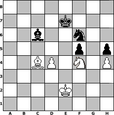 Partie-Notation im PGN-Format [Event "Fr"] [Site "www.mySchach.de"] [Date "2007.03.22"] [Round "1"] [Board "2"] [White "MikeChess"] [Black "Phantasos"] [ECO "A22"] [WhitemyELO "1625"] [BlackmyELO "2152"] [Result "1/2-1/2"] [TimeControl "10/1728000"] [WhiteDays "20"] [BlackDays "18"] [MySchachNr "33579"] 1. c4 e5 2. Nc3 Nf6 3. Nf3 Nc6 4. g3 d5 5. cxd5 Nxd5 6. Bg2 Nxc3 7. bxc3 e4 8. Ng1 f5 9. f3 e3 10. dxe3 Qxd1+ 11. Kxd1 Be6 12. Nh3 Bc4 13. Nf4 Ne5 14. Kc2 Rd8 15. Rd1 Rxd1 16. Kxd1 Bd6 17. Kc2 Kf7 18. Nd3 b6 19. Bd2 Re8 20. a4 Nd7 21. a5 b5 22. Re1 Nf6 23. Bh3 g6 24. Bg2 g5 25. f4 Ne4 26. fxg5 Kg6 27. Nf4+ Kxg5 28. Bc1 b4 29. cxb4 Bxb4 30. Rd1 Bb5 31. h4+ Kf6 32. Bb2+ Kf7 33. Rd5 Nd6 34. Be5 Ba4+ 35. Kc1 Nc4 36. Bxc7 Rxe3 37. Rd3 Rxd3 38. exd3 Bd2+ 39. Kb1 Bxa5 40. Bd5+ Ke7 41. Bb8 Nd2+ 42. Kb2 Nf1 43. Bxa7 Nxg3 44. Bc5+ Ke8 45. Bf2 Nf1 46. Ne6 Bd7 47. Ng5 h6 48. Nf7 h5 49. Ne5 Bc7 50. d4 Ke7 51. Kc3 Be8 52. Bg2 Nh2 53. Bg3 Ng4 54. Ng6+ Kd7 55. Bxc7 Kxc7 56. Nf4 Kd6 57. Bf1 Bf7 58. Kd2 Nf6 59. Be2 Be8 60. Bc4 Bc6 61. Ke2 Ke7 1/2-1/2 Stellungs-Notation im FEN-Format 8/4k3/2b2n2/5p1p/2BP1N1P/8/4K3/8 - - - 12 62 Geschlagene Figuren Weiss: Geschlagene Figuren Schwarz: Klicken Sie auf eine geschlagene Figur um den gewünschten Zug darzustellen!
