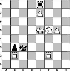 Partie-Notation im PGN-Format [Event "Novemberturnier"] [Site "www.mySchach.de"] [Date "2004.11.04"] [Round "1"] [White "UPS"] [Black "rikilatic"] [ECO "C20"] [WhitemyELO "1493"] [BlackmyELO "1384"] [Result "1-0"] [TimeControl "10/2592000"] [WhiteDays "209"] [BlackDays "210"] [MySchachNr "7772"] 1. e4 e5 2. d3 Qf6 3. Nf3 Bc5 4. Be2 h6 5. O-O Nc6 6. c3 d6 7. h3 g5 8. Nh2 Nge7 9. Bh5 Be6 10. Be3 Ng6 11. Ng4 Bxg4 12. Qxg4 Nd8 13. g3 Ne6 14. Nd2 O-O-O 15. Nb3 Bb6 16. d4 Rhg8 17. d5 Ngf4 18. dxe6 fxe6 19. a4 Nxh5 20. Qxh5 g4 21. hxg4 Qf3 22. Nd2 Qxg4 23. Qxg4 Rxg4 24. Bxb6 axb6 25. Kg2 Rh8 26. Rh1 Kd7 27. c4 h5 28. f3 Rg5 29. a5 bxa5 30. Rxa5 h4 31. g4 b6 32. Ra7 Rg6 33. b4 Rg7 34. Nf1 Rf7 35. Kf2 Kc6 36. Ke3 h3 37. Ra2 d5 38. cxd5+ Kb5 39. dxe6 Re7 40. Rb2 Rxe6 41. Ng3 Rc6 42. Nh5 Rc3+ 43. Kf2 c5 44. bxc5+ Kxc5 45. Rxh3 b5 46. g5 b4 47. Kg3 b3 48. Kg4 Kc4 49. Rhh2 Rd8 50. Nf6 Rd1 51. Rhf2 Rg1+ 52. Kf5 Rg3 53. f4 exf4 54. Kxf4 Rg1 55. e5 Rcg3 56. Ne4 Kb4 57. Nxg3 Rc1 58. e6 Rc8 59. e7 Re8 60. Nf5 Kc3 61. Ke5 1-0 Stellungs-Notation im FEN-Format 4r3/4P3/8/4KNP1/8/1pk5/1R3R2/8 - - - 4 61 Geschlagene Figuren Weiss: Geschlagene Figuren Schwarz: Klicken Sie auf eine geschlagene Figur um den gewünschten Zug darzustellen!