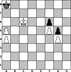 Partie-Notation im PGN-Format [Event "Hertener Schachfreunde-Jahresstart"] [Site "www.mySchach.de"] [Date "2012.02.01"] [Round "1"] [White "rikilatic"] [Black "Rotstift10"] [ECO "B10"] [WhitemyELO "1471"] [BlackmyELO "1551"] [Result "1-0"] [TimeControl "10/2592000"] [WhiteDays "201"] [BlackDays "183"] [MySchachNr "79540"] 1. e4 c6 2. Bc4 b5 3. Bb3 e6 4. Qf3 Qf6 5. d3 Qxf3 6. Nxf3 h6 7. Bf4 d6 8. Nbd2 e5 9. Bg3 Nf6 10. a4 b4 11. h3 a5 12. Nc4 Ra6 13. Bh4 Nbd7 14. g4 g5 15. Bg3 Nc5 16. Ncd2 Nxb3 17. Nxb3 Be6 18. Nbd2 Be7 19. Nf1 c5 20. Ne3 b3 21. cxb3 Bxb3 22. Nf5 Bf8 23. Nd2 Be6 24. Ne3 Bg7 25. Nf5 Bxf5 26. exf5 O-O 27. Nc4 Nd5 28. h4 gxh4 29. Rxh4 Re8 30. Kd2 Bf6 31. Rh2 Bg5+ 32. Ke2 Nf4+ 33. Bxf4 Bxf4 34. Rh5 f6 35. Ne3 Bg5 36. Nd5 Rd8 37. Nc7 Rb6 38. Rb1 Rdb8 39. Nb5 d5 40. f3 c4 41. dxc4 dxc4 42. Rd1 Kf8 43. Rh2 Ke7 44. Kf1 Rd8 45. Ke2 Rxd1 46. Kxd1 Kd7 47. Rc2 Rc6 48. Ke2 Rc5 49. b3 c3 50. Rxc3 Rxc3 51. Nxc3 Kc6 52. Kd3 Kc5 53. Ne4+ Kb4 54. Nxg5 hxg5 55. Kc2 Kc5 56. Kc3 Kd5 57. b4 e4 58. fxe4+ Kxe4 59. bxa5 Kd5 60. Kb4 Kc6 61. Kc4 Kd6 62. Kb5 Kc7 63. Ka6 Kb8 64. Kb6 Ka8 65. Kc6 1-0 Stellungs-Notation im FEN-Format k7/8/2K2p2/P4Pp1/P5P1/8/8/8 - - - 12 65 Geschlagene Figuren Weiss: Geschlagene Figuren Schwarz: Klicken Sie auf eine geschlagene Figur um den gewünschten Zug darzustellen!
