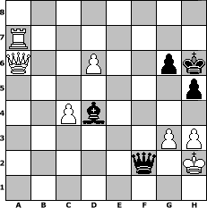 Partie-Notation im PGN-Format [Event "Sp"] [Site "www.mySchach.de"] [Date "2011.09.07"] [Round "1"] [White "Zwilling"] [Black "Caligula"] [ECO "D00"] [WhitemyELO "1506"] [BlackmyELO "1361"] [Result "0-1"] [TimeControl "10/1728000"] [WhiteDays "20"] [BlackDays "20"] [MySchachNr "76192"] 1. d4 d5 2. Bf4 e6 3. Nf3 Nf6 4. Bg5 Be7 5. Bxf6 Bxf6 6. e3 c5 7. Bb5+ Bd7 8. Bxd7+ Qxd7 9. c3 c4 10. Nbd2 Nc6 11. O-O O-O 12. h3 a5 13. a4 Na7 14. e4 b5 15. e5 Be7 16. axb5 Qxb5 17. Qc2 Nc6 18. b3 f6 19. bxc4 dxc4 20. Rfb1 Qa6 21. exf6 Rxf6 22. Qa4 Bd6 23. Ne4 Be7 24. Nxf6+ Bxf6 25. Nd2 h6 26. Nxc4 Bd8 27. Re1 Kf7 28. Ne5+ Nxe5 29. Rxe5 Qd6 30. Qd1 Bf6 31. Qh5+ Kg8 32. Rexa5 Rc8 33. Ra8 Rxa8 34. Rxa8+ Kh7 35. Qf3 Qc7 36. Qe4+ g6 37. Qxe6 Qg7 38. Qa6 Qf7 39. d5 h5 40. d6 Kh6 41. Ra7 Qe6 42. c4 Qe1+ 43. Kh2 Be5+ 44. g3 Qxf2+ 45. Kh1 Qf3+ 46. Kg1 Bd4+ 47. Kh2 Qf2+ 0-1 Stellungs-Notation im FEN-Format 8/R7/Q2P2pk/7p/2Pb4/6PP/5q1K/8 - - - 6 48 Geschlagene Figuren Weiss: Geschlagene Figuren Schwarz: Klicken Sie auf eine geschlagene Figur um den gewünschten Zug darzustellen!