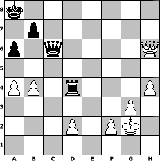 Partie-Notation im PGN-Format [Event "M"] [Site "www.mySchach.de"] [Date "2012.07.12"] [Round "1"] [White "reisinger"] [Black "Stecher1966"] [ECO "D10"] [WhitemyELO "1460"] [BlackmyELO "1478"] [Result "0-1"] [TimeControl "10/3456000"] [WhiteDays "40"] [BlackDays "38"] [MySchachNr "82728"] 1. d4 d5 2. c4 c6 3. cxd5 cxd5 4. Nc3 h6 5. Bf4 a6 6. e3 Bf5 7. Bd3 Bxd3 8. Qxd3 Nf6 9. Nf3 Nc6 10. a3 e6 11. Rd1 Bd6 12. Bxd6 Qxd6 13. O-O O-O 14. Rfe1 Rac8 15. e4 dxe4 16. Nxe4 Nxe4 17. Rxe4 f5 18. Rh4 Rfd8 19. g3 Rd7 20. Qe3 Qe7 21. Ne5 Nxe5 22. Qxe5 Rd5 23. Qe3 e5 24. Rxh6 gxh6 25. Qxh6 Rxd4 26. Qg6+ Kh8 27. Re1 Rcd8 28. Qxf5 Rd1 29. Qh5+ Qh7 30. Qxe5+ Qg7 31. Qh5+ Qh7 32. Qe5+ Kg8 33. Qe6+ Kf8 34. Rxd1 Rxd1+ 35. Kg2 Qd7 36. Qf6+ Ke8 37. Qh8+ Ke7 38. Qg7+ Kd8 39. Qf8+ Kc7 40. Qf4+ Rd6 41. h4 Kb6 42. Qe3+ Rd4 43. b4 Ka7 44. a4 Ka8 45. Qh6 Qc6+ 0-1 Stellungs-Notation im FEN-Format k7/1p6/p1q4Q/8/PP1r3P/6P1/3P1PK1/8 - - - 3 46 Geschlagene Figuren Weiss: Geschlagene Figuren Schwarz: Klicken Sie auf eine geschlagene Figur um den gewünschten Zug darzustellen!