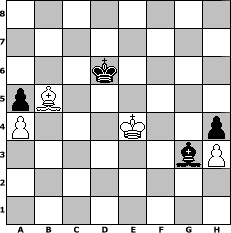 Partie-Notation im PGN-Format [Event "Nuevo Relax 2010"] [Site "www.mySchach.de"] [Date "2010.09.02"] [Round "1"] [White "beowulf"] [Black "rikilatic"] [ECO "A40"] [WhitemyELO "1373"] [BlackmyELO "1466"] [Result "1/2-1/2"] [TimeControl "10/3456000"] [WhiteDays "228"] [BlackDays "231"] [MySchachNr "68093"] 1. d4 g6 2. c4 Bg7 3. Nf3 c6 4. Nc3 d6 5. Bg5 Qb6 6. Qd2 Bg4 7. e3 Bxf3 8. gxf3 h6 9. Bh4 Na6 10. a3 g5 11. Bg3 Nf6 12. O-O-O Qb3 13. Qc2 Qxc2+ 14. Kxc2 h5 15. h3 Nd7 16. f4 gxf4 17. Bxf4 O-O-O 18. Bd3 e5 19. Bg5 f6 20. Bh4 exd4 21. exd4 Nc7 22. Bf5 Kb8 23. Rhg1 Bh6 24. Rg6 Rdg8 25. Bxf6 Nxf6 26. Rxf6 Rf8 27. Rxf8+ Rxf8 28. Bg6 Rxf2+ 29. Kb1 h4 30. d5 cxd5 31. Nxd5 Nxd5 32. Rxd5 Bf4 33. Rf5 Kc7 34. Bf7 a6 35. Bd5 Bg3 36. Rxf2 Bxf2 37. Kc2 b5 38. b3 Kb6 39. Kc3 Be1+ 40. Kd3 Kc5 41. Be6 a5 42. Bd7 bxc4+ 43. bxc4 Bg3 44. Be8 Bf2 45. Bd7 d5 46. cxd5 Kxd5 47. a4 Kd6 48. Bb5 Ke5 49. Bd7 Kd6 50. Bb5 Bg3 51. Ke4 1/2-1/2 Stellungs-Notation im FEN-Format 8/8/3k4/pB6/P3K2p/6bP/8/8 - - - 8 51 Geschlagene Figuren Weiss: Geschlagene Figuren Schwarz: Klicken Sie auf eine geschlagene Figur um den gewünschten Zug darzustellen!