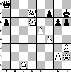 Partie-Notation im PGN-Format [Event "Vierspringerspiel"] [Site "www.mySchach.de"] [Date "2008.10.27"] [Round "2"] [White "thw"] [Black "OwainGwynedd"] [ECO "C49"] [WhitemyELO "1496"] [BlackmyELO "1481"] [Result "1-0"] [TimeControl "10/2592000"] [WhiteDays "150"] [BlackDays "085"] [MySchachNr "49192"] 1. e4 e5 2. Nf3 Nc6 3. Nc3 Nf6 4. Bb5 Bb4 5. O-O O-O 6. d3 d6 7. Bg5 Ne7 8. Bxf6 Bxc3 9. Bxe7 Qxe7 10. bxc3 a6 11. Ba4 c5 12. h3 Be6 13. Bb3 b5 14. Re1 Bd7 15. Bd5 Rab8 16. Qc1 h6 17. Qa3 Bc8 18. Rab1 Qc7 19. Re2 Bb7 20. Bxb7 Qxb7 21. d4 exd4 22. cxd4 Ra8 23. dxc5 dxc5 24. Qxc5 Rfe8 25. e5 Qd7 26. Rd2 Qe6 27. a3 Rec8 28. Qd6 Qe8 29. Re1 Rd8 30. Qc5 Rxd2 31. Nxd2 Rc8 32. Qb4 Rxc2 33. f4 Rc6 34. Ne4 Qa8 35. Nd6 Rc7 36. Kh2 Rd7 37. Rc1 Kh7 38. a4 bxa4 39. Qxa4 g6 40. Qxd7 1-0 Stellungs-Notation im FEN-Format q7/3Q1p1k/p2N2pp/4P3/5P2/7P/6PK/2R5 - - - 0 40 Geschlagene Figuren Weiss: Geschlagene Figuren Schwarz: Klicken Sie auf eine geschlagene Figur um den gewünschten Zug darzustellen!