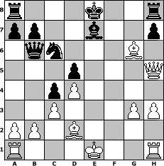 Partie-Notation im PGN-Format [Event "Stonewall"] [Site "www.mySchach.de"] [Date "2017.03.26"] [Round "1"] [White "Cuibono"] [Black "sprinterde"] [ECO "D00"] [WhitemyELO "2184"] [BlackmyELO "1726"] [Result "1-0"] [TimeControl "10/2592000"] [WhiteDays "60"] [BlackDays "60"] [MySchachNr "107578"] 1. d4 d5 2. e3 Nf6 3. Bd3 c5 4. c3 Nc6 5. f4 c4 6. Bc2 Bg4 7. Nf3 Ne4 8. Nbd2 Nxd2 9. Bxd2 e6 10. e4 Be7 11. h3 Bxf3 12. Qxf3 Bh4+ 13. g3 Be7 14. f5 Qb6 15. fxe6 fxe6 16. exd5 exd5 17. Qh5+ g6 18. Bxg6+ 1-0 Stellungs-Notation im FEN-Format r3k2r/pp2b2p/1qn3B1/3p3Q/2pP4/2P3PP/PP1B4/R3K2R - KQkq - 0 18 Geschlagene Figuren Weiss: Geschlagene Figuren Schwarz: Klicken Sie auf eine geschlagene Figur um den gewünschten Zug darzustellen!