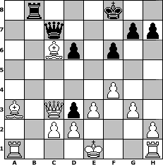 Partie-Notation im PGN-Format [Event "Emanual Lasker - 70. Todestag"] [Site "www.mySchach.de"] [Date "2011.01.11"] [Round "1"] [White "haggard"] [Black "BobbyF4"] [ECO "A20"] [WhitemyELO "1876"] [BlackmyELO "1679"] [Result "1-0"] [TimeControl "10/2592000"] [WhiteDays "90"] [BlackDays "60"] [MySchachNr "71096"] 1. c4 e5 2. g3 Nc6 3. Bg2 Bc5 4. Nc3 d6 5. a3 Nge7 6. e3 Bf5 7. b4 Bxb4 8. axb4 Bd3 9. Qa4 Qb8 10. b5 Nd8 11. b6+ Ndc6 12. Nd5 O-O 13. Nxc7 axb6 14. Nxa8 e4 15. Nxb6 Rd8 16. Qb3 Ne5 17. f4 N5c6 18. Bb2 Nf5 19. Nh3 Qc7 20. Nf2 Nfe7 21. Qc3 f6 22. Nd5 Nxd5 23. cxd5 Rb8 24. Nxd3 exd3 25. dxc6 bxc6 26. Bxc6 Kf8 27. Ba3 1-0 Stellungs-Notation im FEN-Format 1r3k2/2q3pp/2Bp1p2/8/5P2/B1QpP1P1/2PP3P/R3K2R - KQ - 2 27 Geschlagene Figuren Weiss: Geschlagene Figuren Schwarz: Klicken Sie auf eine geschlagene Figur um den gewünschten Zug darzustellen!