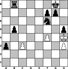Partie-Notation im PGN-Format [Event "Pfingst -Turnier"] [Site "www.mySchach.de"] [Date "2009.05.30"] [Round "1"] [White "Ostseeboy"] [Black "alpacino"] [ECO "C44"] [WhitemyELO "1261"] [BlackmyELO "1325"] [Result "0-1"] [TimeControl "10/2592000"] [WhiteDays "148"] [BlackDays "139"] [MySchachNr "56166"] 1. e4 e5 2. Nf3 Nc6 3. Be2 Nf6 4. Nc3 Bb4 5. O-O Bxc3 6. bxc3 Nxe4 7. Bb2 O-O 8. d3 Nf6 9. Re1 d6 10. Nd2 Nd5 11. c4 Nf4 12. Bf1 Be6 13. Nf3 Bg4 14. Be2 Bxf3 15. Bxf3 Qg5 16. a4 Nh3+ 17. Kf1 Nf4 18. Bc1 Nd4 19. c3 Nxf3 20. Qxf3 Qg6 21. Qg3 Qxd3+ 22. Qxd3 Nxd3 23. Rd1 e4 24. f3 Nc5 25. Be3 exf3 26. gxf3 b6 27. Ke2 Rfe8 28. a5 Re6 29. axb6 cxb6 30. Rd5 a5 31. Kd2 Nb3+ 32. Ke2 Nxa1 33. Kf2 Rxe3 34. Kxe3 Nc2+ 35. Kd3 Ne1+ 36. Ke4 Re8+ 37. Kf4 Ng2+ 38. Kg3 Ne3 39. Rxd6 Nxc4 40. Rc6 b5 41. Rc5 Rb8 42. Kf2 a4 43. Re5 Nxe5 44. f4 Ng4+ 45. Kg3 h5 46. h3 Nf6 47. Kh4 a3 0-1 Stellungs-Notation im FEN-Format 1r4k1/5pp1/5n2/1p5p/5P1K/p1P4P/8/8 - - - 0 48 Geschlagene Figuren Weiss: ![]() ![]() ![]() ![]() ![]() ![]() ![]() ![]() ![]() ![]() ![]() ![]() ![]() ![]() ![]() Geschlagene Figuren Schwarz: ![]() ![]() ![]() ![]() ![]() ![]() ![]() ![]() ![]() ![]() ![]() ![]() ![]() ![]() ![]() Klicken Sie auf eine geschlagene Figur um den gewünschten Zug darzustellen!