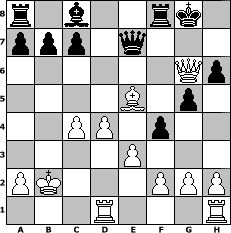 Partie-Notation im PGN-Format [Event "unter uns Nr. 17"] [Site "www.mySchach.de"] [Date "2014.02.13"] [Round "1"] [White "beowulf"] [Black "Knight"] [ECO "A15"] [WhitemyELO "1350"] [BlackmyELO "1233"] [Result "1-0"] [TimeControl "10/864000"] [WhiteDays "20"] [BlackDays "20"] [MySchachNr "92902"] 1. c4 Nf6 2. d4 e6 3. Nf3 d5 4. Bg5 Bb4+ 5. Nc3 O-O 6. e3 Nc6 7. Qc2 h6 8. Bf4 Ne4 9. Bd3 g5 10. Bg3 f5 11. Ne5 Nxe5 12. Bxe5 f4 13. O-O-O Bxc3 14. Bxe4 Bxb2+ 15. Kxb2 dxe4 16. Qxe4 Qe7 17. Qg6+ 1-0 Stellungs-Notation im FEN-Format r1b2rk1/ppp1q3/6Qp/4B1p1/2PP1p2/4P3/PK3PPP/3R3R - - - 2 17 Geschlagene Figuren Weiss: Geschlagene Figuren Schwarz: Klicken Sie auf eine geschlagene Figur um den gewünschten Zug darzustellen!