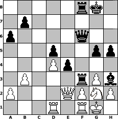 Partie-Notation im PGN-Format [Event "Sommerevent"] [Site "www.mySchach.de"] [Date "2018.07.12"] [Round "1"] [White "Ziegert"] [Black "FrankB"] [ECO "C05"] [WhitemyELO "1622"] [BlackmyELO "1654"] [Result "0-1"] [TimeControl "10/1728000"] [WhiteDays "00"] [BlackDays "17"] [MySchachNr "112613"] 1. e4 e6 2. d4 d5 3. Nd2 Nf6 4. e5 Nfd7 5. Bd3 c5 6. c3 Nc6 7. Ngf3 Be7 8. O-O O-O 9. b3 cxd4 10. cxd4 Qb6 11. Nb1 f6 12. Be3 Qc7 13. exf6 Nxf6 14. Nc3 a6 15. Qd2 Ba3 16. Ng5 Nb4 17. Nb1 Nxd3 18. Nxa3 Qd6 19. Nc2 Ng4 20. g3 e5 21. Qxd3 e4 22. Qe2 h6 23. Nh3 Nxe3 24. Nxe3 Bxh3 25. Rfe1 Rf3 26. Ng2 g5 27. Red1 Raf8 28. Rf1 Qf6 29. Rad1 h5 0-1 Stellungs-Notation im FEN-Format 5rk1/1p6/p4q2/3p2pp/3Pp3/1P3rPb/P3QPNP/3R1RK1 - - - 0 30 Geschlagene Figuren Weiss: Geschlagene Figuren Schwarz: Klicken Sie auf eine geschlagene Figur um den gewünschten Zug darzustellen!