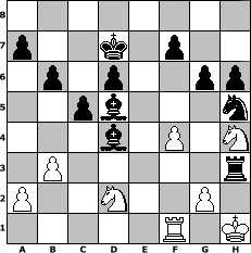 Partie-Notation im PGN-Format [Event "Juni 2017"] [Site "www.mySchach.de"] [Date "2017.06.16"] [Round "1"] [White "augustus"] [Black "Naunhofer"] [ECO "B20"] [WhitemyELO "1227"] [BlackmyELO "1648"] [Result "0-1"] [TimeControl "10/1728000"] [WhiteDays "58"] [BlackDays "60"] [MySchachNr "108606"] 1. e4 c5 2. Bc4 Nc6 3. c3 d6 4. Qf3 Ne5 5. Qe2 Nxc4 6. Qxc4 Nf6 7. Nf3 h6 8. d4 Nxe4 9. Be3 b6 10. d5 Nf6 11. Nbd2 Bb7 12. Qb5+ Qd7 13. Qxd7+ Kxd7 14. c4 e6 15. O-O exd5 16. cxd5 Bxd5 17. Nh4 g6 18. f3 Bg7 19. b3 Rhe8 20. h3 Rxe3 21. Rfe1 Rae8 22. Rxe3 Rxe3 23. Rf1 Nh5 24. f4 Bd4 25. Kh1 Rxh3# 0-1 Stellungs-Notation im FEN-Format 8/p2k1p2/1p1p2pp/2pb3n/3b1P1N/1P5r/P2N2P1/5R1K - - - 0 26 Geschlagene Figuren Weiss: Geschlagene Figuren Schwarz: Klicken Sie auf eine geschlagene Figur um den gewünschten Zug darzustellen!