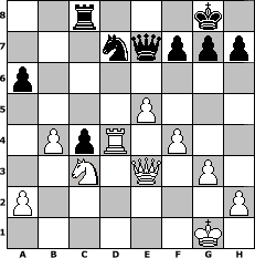 Partie-Notation im PGN-Format [Event "Weihnachtstunier"] [Site "www.mySchach.de"] [Date "2005.12.14"] [Round "1"] [White "Bolligru"] [Black "otto01"] [ECO "D02"] [WhitemyELO "1875"] [BlackmyELO "2132"] [Result "1-0"] [TimeControl "10/864000"] [WhiteDays "08"] [BlackDays "10"] [MySchachNr "20741"] 1. d4 d5 2. Nf3 Nf6 3. c4 e6 4. g3 dxc4 5. Bg2 a6 6. O-O Nc6 7. e3 Bd7 8. Qe2 Bd6 9. Rd1 O-O 10. e4 e5 11. dxe5 Nxe5 12. Nxe5 Bxe5 13. Qxc4 Qe7 14. Nc3 Bg4 15. f3 Be6 16. Qe2 c5 17. Be3 Rfd8 18. Na4 Bd4 19. Rac1 Rac8 20. Bxd4 cxd4 21. Rxc8 Bxc8 22. Qc4 Be6 23. Qc5 Qd7 24. Nc3 d3 25. Rd2 b5 26. Bf1 Rc8 27. Qb6 Rc6 28. Qe3 Bc4 29. b3 Be6 30. Rxd3 Qe7 31. b4 Bc4 32. Rd4 Rc8 33. Bxc4 bxc4 34. e5 Nd7 35. f4 1-0 Stellungs-Notation im FEN-Format 2r3k1/3nqppp/p7/4P3/1PpR1P2/2N1Q1P1/P6P/6K1 - - - 0 35 Geschlagene Figuren Weiss: Geschlagene Figuren Schwarz: Klicken Sie auf eine geschlagene Figur um den gewünschten Zug darzustellen!